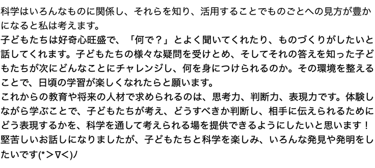 私の趣味は科学実験のネタを探すことや旅行なのですが、勉強してきたからこそ好奇心の赴くままに生きられることが楽しくて仕方がありません。 科学実験教室でも色んな分野に触れ、私自身ももっともっと学び続けていきたいです!