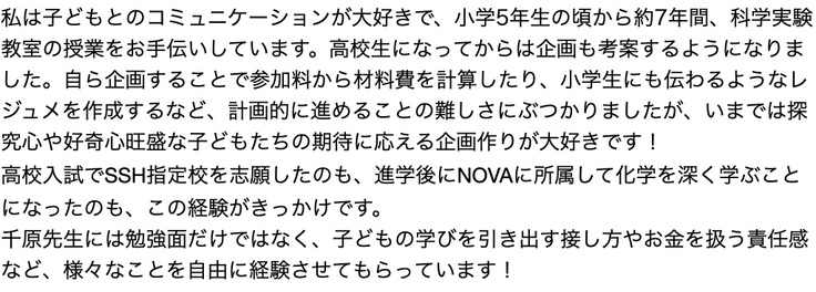 私をサポートしてくれるだけではなく、自ら企画を提案してくれたり、また、進学先である文部科学省のスーパーサイエンスハイスクール指定校で大学へのサイエンスツアーやフィールドワークなどの様々な取り組みに参加したりしています。