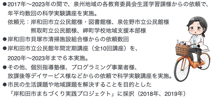 大阪府南泉州地域で科学実験教室を運営する千原恭子は、科学を楽しむ体験を通して子どもたちの学ぶ意欲を伸ばすため、これまで運営してきた教室を拡充します。集まった資金は、ホームページのリニューアルや動画教材などの制作に充てます。