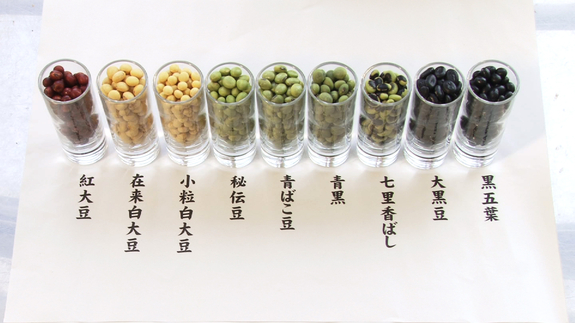 写真でズラリと並んでいるのは、山形県で栽培・自家採種されている数々の豆の一例です。