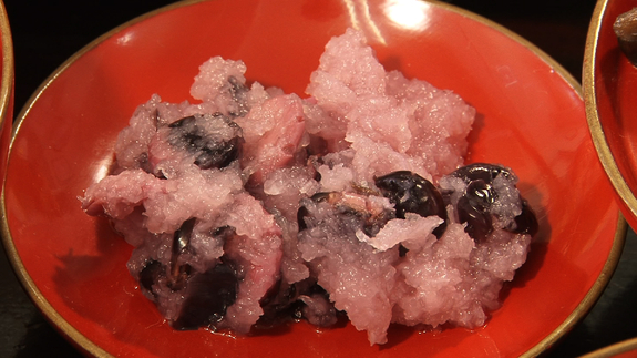 (大黒豆のナマス:大根が豆の色素で淡い桃色に染まって綺麗な一品です。)