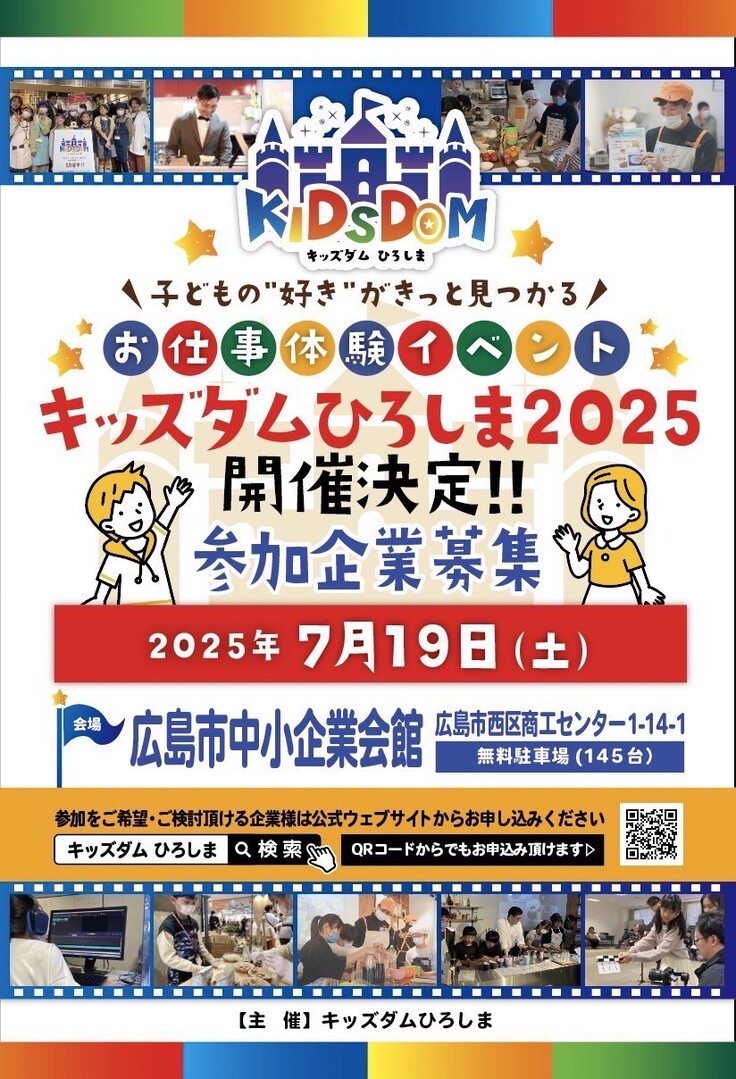 イベント名を『キッズダムひろしま2025』と銘打ち、7月19日(土)に広島市西区にある中小企業会館を会場に予定しています。
