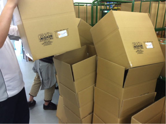 食品を入れる段ボールを組み立てます。1箱はおおよそ15〜18kgくらいの重量になるため、しっかりとテープ止めします。