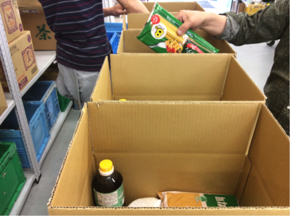 今年度の1回目の食の応援パッケージは、保護者からキッズドアさんに申込みがあったご家庭から順次送付します。本日、その第1弾となる食品詰め合わせセットを発送しましたので、その様子を写真でご紹介します。(障がいをお持ちの方々がトレーニング中なのでお顔が写らないように撮影しています。)