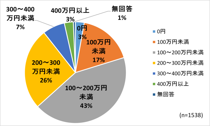 キッズドアファミリーサポートに登録している困窮子育て家庭の8割以上は、世帯所得300万円未満です。約4割では1か月の食費を「2万円未満」で生活しており、貯金はありません。