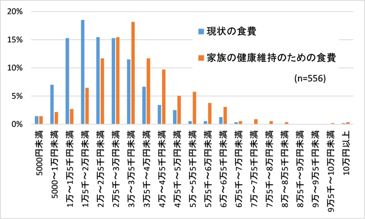 一般的な母子世帯(子1人)の平均は5万円弱。困窮家庭ではこの半分以下の食費しかかけることができません。この家族構成だと1人当たり月に1万円、1日300円程度の食費で生活していることになります。