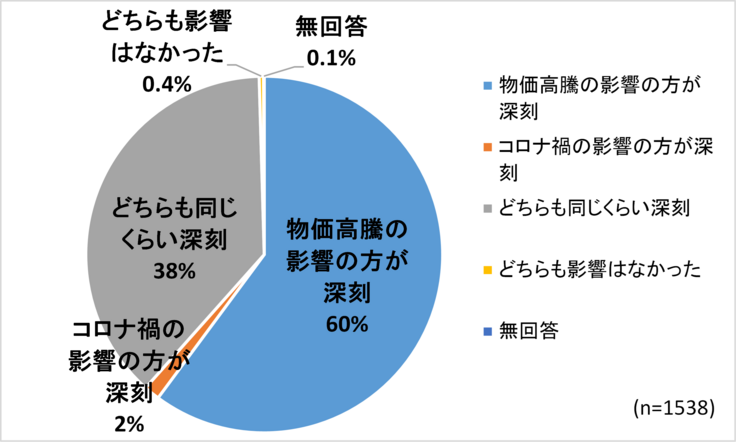 全体の60%は「コロナ禍よりも物価高騰の方が深刻」、38%の「コロナ禍と同じくらい深刻」を加えると、ほぼ全世帯となる98%がコロナ禍以上の深刻度を感じています。