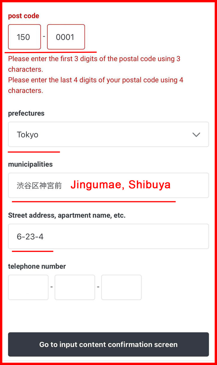 7. If you are living outside of Japan and cannot proceed due to the postcode, put 150 0001 for it, and use the KIV office address [Tokyo, Jingumae, Shibuya, 6-23-4] as our Japan address.