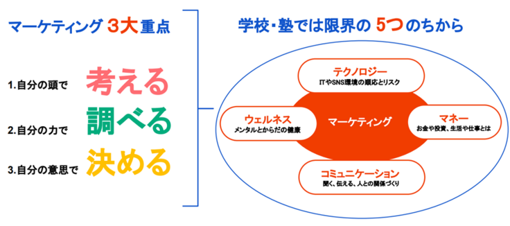 私たちが考える「生きるちから」とは、課題や困難があったときに、独りよがりではなく、周囲との関係性を構築しながら解決させていける力と考えています。それは私たちが創業1990年から実業として取り組んできた企業課題解決のために取り入れる「マーケティングメソッド」の力をつけることで可能となります。なぜかというと、マーケティングの3大重点である「考える」「調べる」「決める」のフェーズを、周囲との協力を得ながら問題や課題に向き合い解決していくからです。