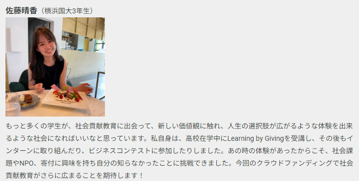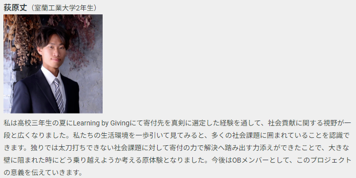 :これまでにLearning by Givingなどの社会貢献教育プログラムを体験し、このプロジェクトを広めたいと参画してくれたメンバー