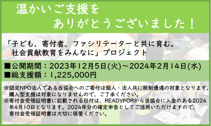 この度は、「子ども、寄付者、ファシリテーターと共に育む。社会貢献教育をみんなに」プロジェクトに、ご支援いただきまして本当にありがとうございました。お陰様で最終的に、90名のみなさまから、お気持ちのこもった122.5万円にのぼる貴重なご寄付を頂くことができました。改めまして厚く御礼申し上げます。