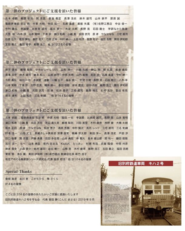 この完成した芳名ボードは11月10日(日)に開催予定のキハ2号公開イベント「円長寺駅まつり」にて除幕式とキハ2号車内への取り付け作業を行います。3年間、計3回の多くの皆様のあたたかいご支援に感謝申し上げます。