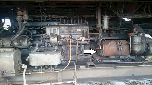 よくよく前田会長が調べると、昭和44年製の発電機のブラシが磨耗しており、バッテリーが全く充電されていないことが判明。(矢印の部品です)