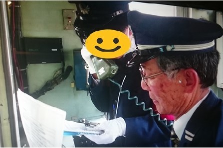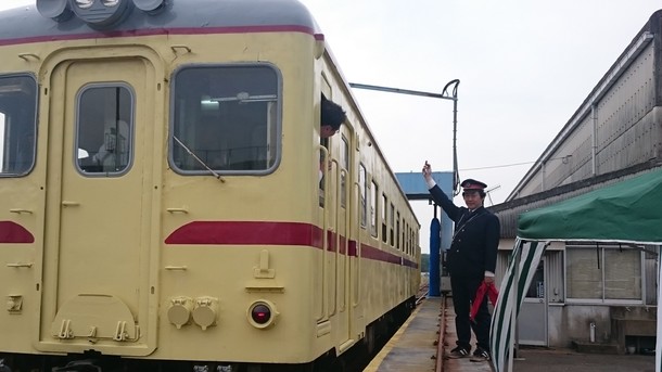 それに伴い、臨場感を出すため、車体補修作業に当たっていただいた(株)ワンマイルの手嶋様と毎熊様に、駅長役を担って頂き、タブレット授受光景の再現や実際に車掌に対する模擬発車合図を出して頂きました。