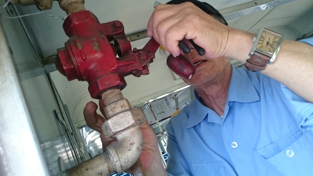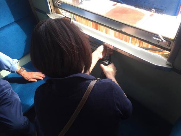 一方、当日は車両の運転準備中に、車掌弁と呼ばれる非常ブレーキ装置の不具合が発生しましたが、さすがは前田会長、あれよあれよと措置を行い、運行にこぎつけて頂きました。