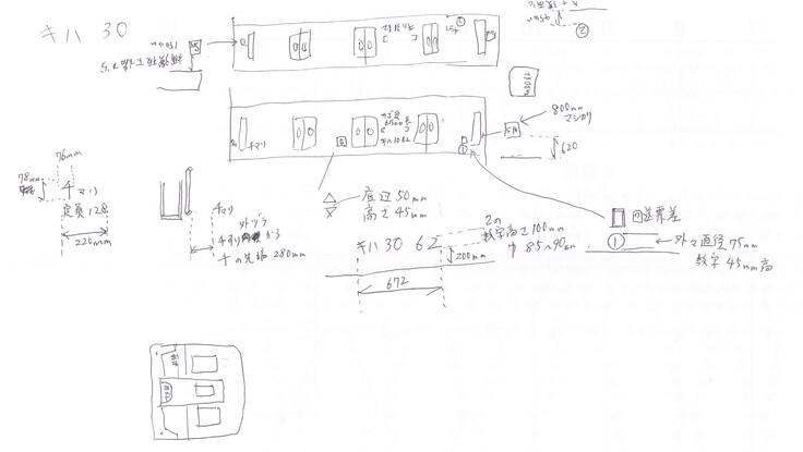 下はそのうちキハ30塗装の際、現場で描いた補足メモです。この後きちんと図面に起こしました。