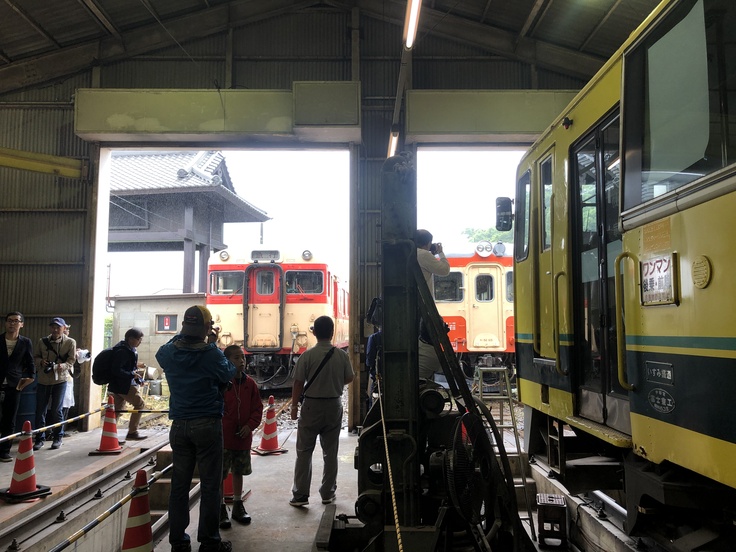 この時は計画だと屋外の上総中野方で場所を作る段取りをしていましたが、この雨を見た同級生の当時運輸主任が気を利かせて、急遽お客様を検修庫から撮影できるよう、車両の移動等をやってくれ場所を確保してくれました。