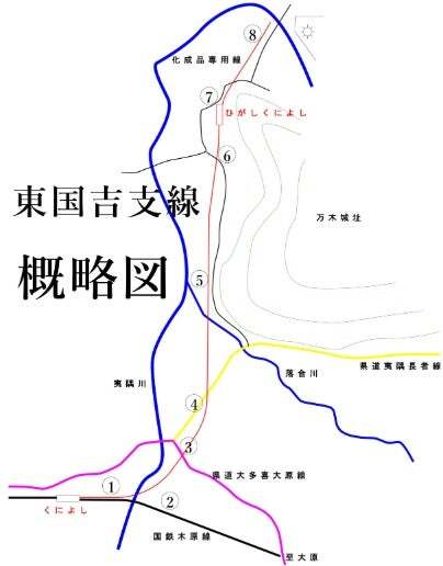 本来は起点の上総一ノ宮から工事が開始される計画でしたが、夷隅町にある化学工場の鉄道利用が急がれ、先に工場至近の東国吉駅までの1.5kmが開通。1日数本の旅客列車とその先に延びる化学工場専用線からの貨物輸送(化学薬品や製品の出荷、原料の到着)が1日1往復運転されていましたが、開通から長い期間は続かず旅客営業廃止の末の貨物専業線・工場専用線化になりその後の木原線貨物列車廃止により廃線となりました。」