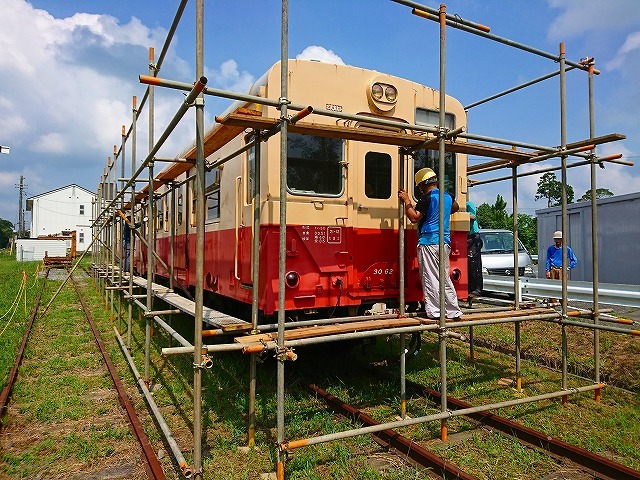 参考までに、鳥塚前社長のクラウドファンディングでキハ30の塗装を行った際の写真をご紹介します。