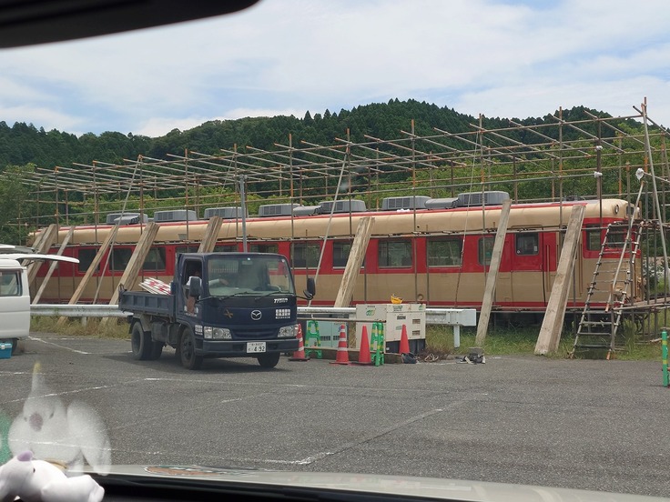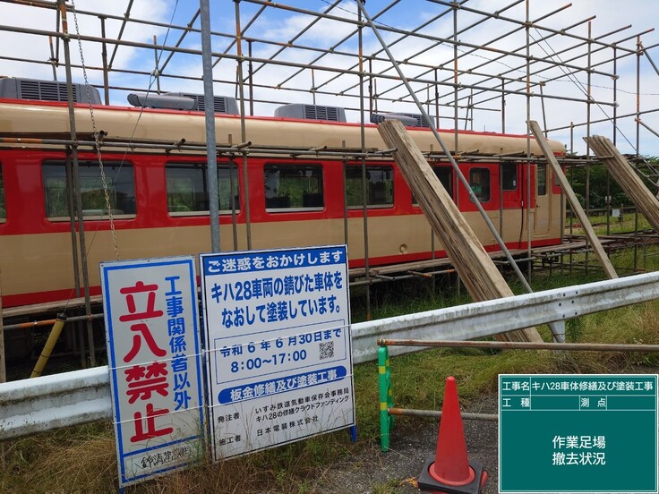 車体修繕と車体塗装が完成し、21日より足場撤去の予定でしたが荒天のため22日土曜日に着手いたしました。