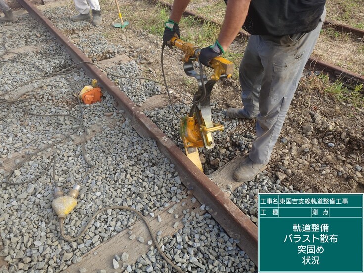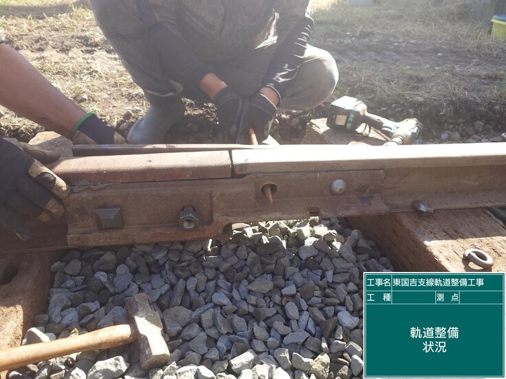 高さ、ゲージ、通り狂いを調べて行き、不良箇所は再度調整して突き固めを行います。