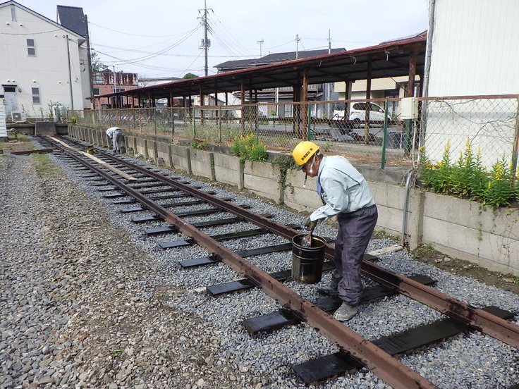 こうすることで枕木の寿命を延ばし、また汚れた感じも出せて一石二鳥です。