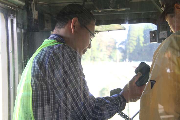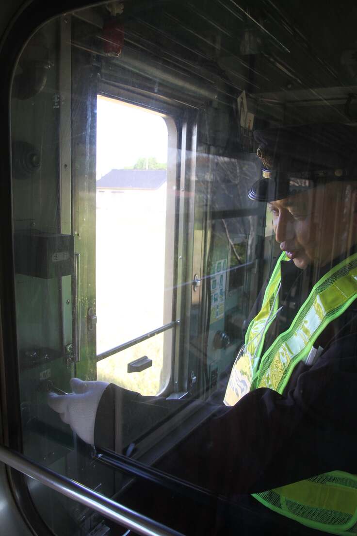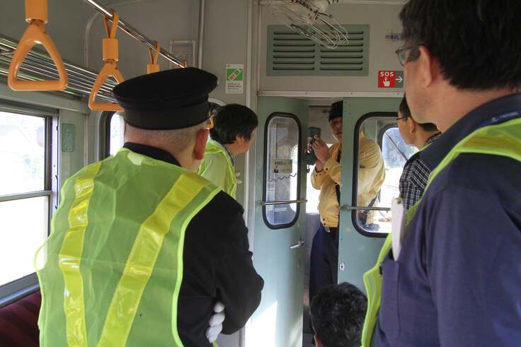 ドア開閉、発車ブザー(気動車ならでは)、発車後放送と一連の流れで体験していただきました。