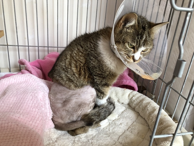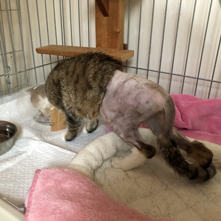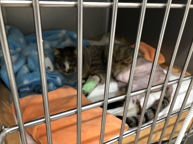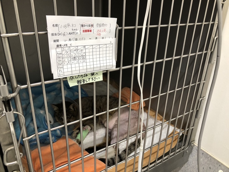 横隔膜が破れ、その箇所から内臓が出て肺を圧迫しているため呼吸困難になる恐れがあるので、横隔膜の整復手術と骨盤が複雑骨折及び脱臼しているため、最低3ヶ所の骨盤の整復手術。避妊手術・ワクチン接種。
