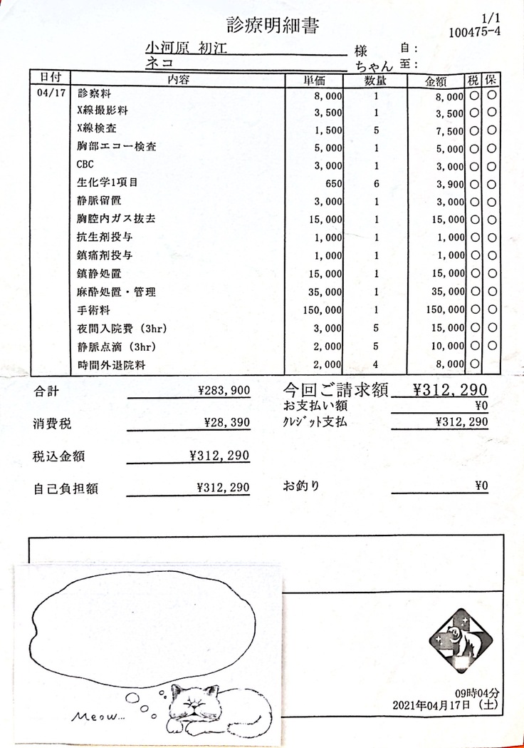 横隔膜ヘルニアの手術・検査・入院代 312,000円(夜間救急動物病院)