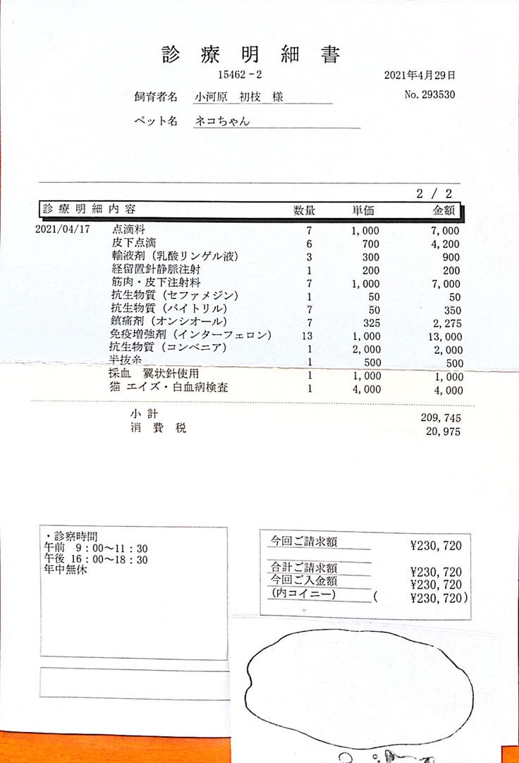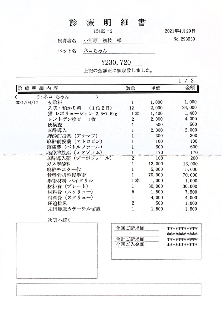 避妊手術・ワクチン接種・退院後の通院費ほか 55,000円