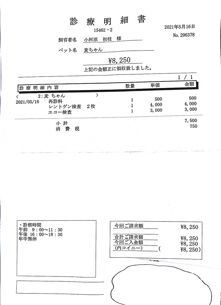 お二人のご好意により、全額麦ちゃんのために使わせていただきます。