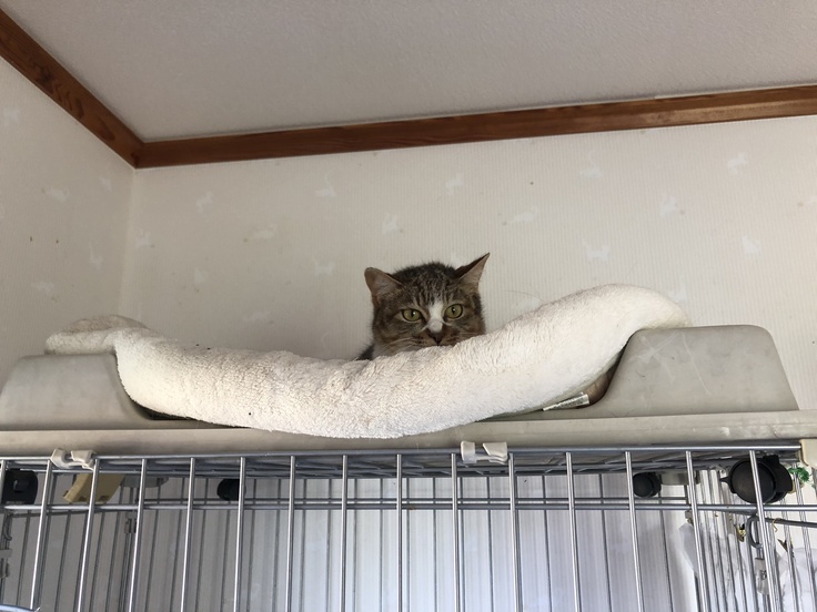 2021年4月16日 仕事帰りにアルバイトのおじさんに呼び止められ、「会社の敷地内に朝から蹲っている猫がいる。」「車と接触したみたい。」「近づいたら隣の会社の敷地に移った。」と言われ一緒に見に行くと、道路に面したフェンスの中に1匹の小さなキジトラ猫がいました。