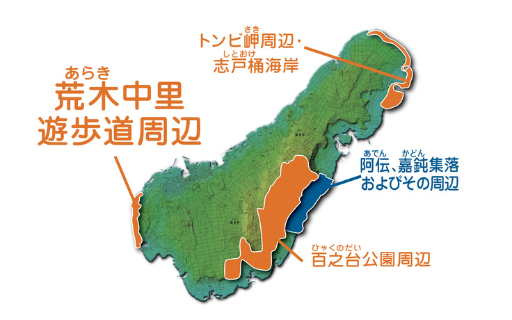 荒木・中里遊歩道は、階段状の隆起サンゴ礁が発達しています。海岸には昔からの植物が生育しており、喜界島特有の景観があります。