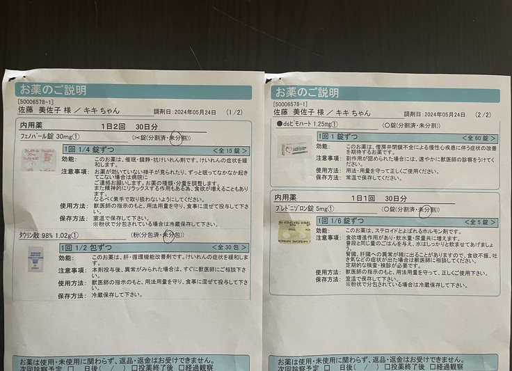 てんかんと心臓病のお薬は量も種類も変わる事なく継続です。