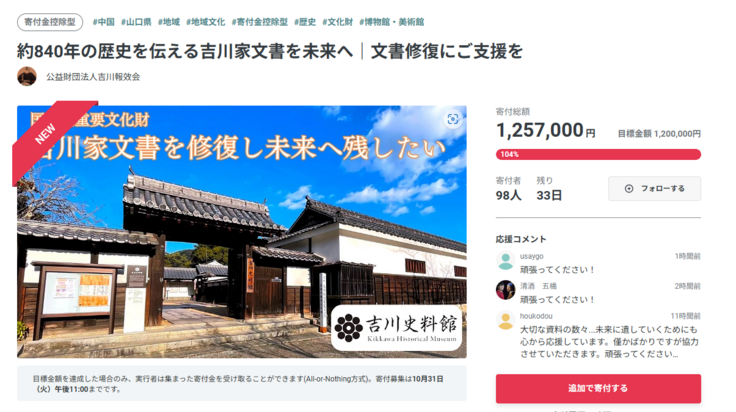 皆様のおかげで目標は達成いたしましたが、10月31日(火)までクラウドファンディングは続きます。引き続き吉川家文書修復のため、どうぞよろしくお願い申し上げます。