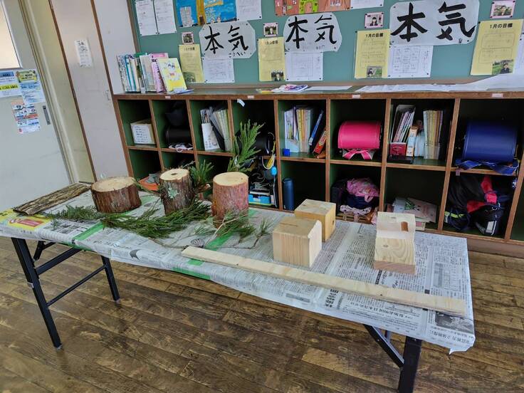 このような根っこの張り方の違いから植林された森林は手入れを行う必要性がある事や林業の担い手が不足している事を伝えました。また、林業での植林は建築材を目的としている事やヒノキ・スギ・松・コナラの活用方法について木材を展示して説明いたしました。