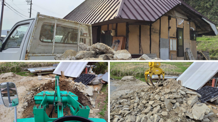 本日は仕事が休みのため、(有)大内林業の機械を借りて、井戸掘りや小型合併浄化槽を設置する時に出たコンクリートや石を撤去しています。