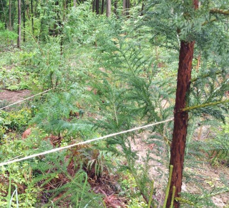 この地域は雪が降るため植林が横たわってしまいます。このまま成長させるとひん曲がった木になり、木材としての価値が落ちます。