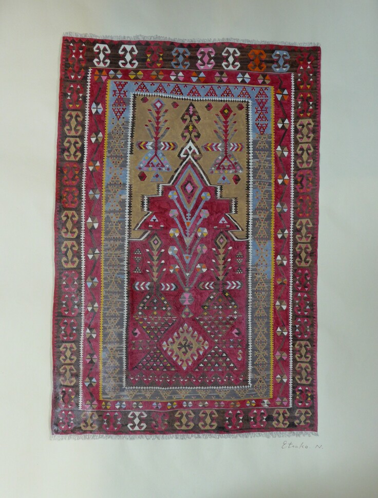 私は中東の遊牧民の織る布キリムを、30年くらい前から水彩で描いて活動して参りました。