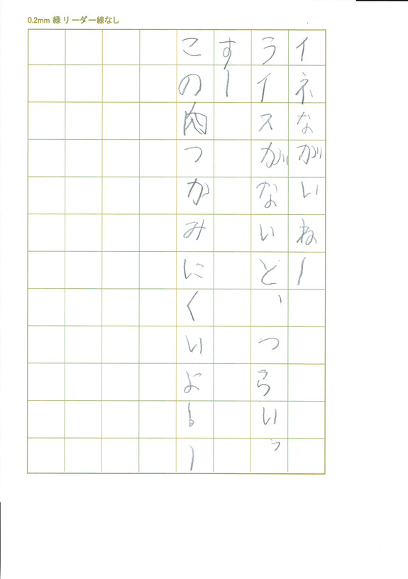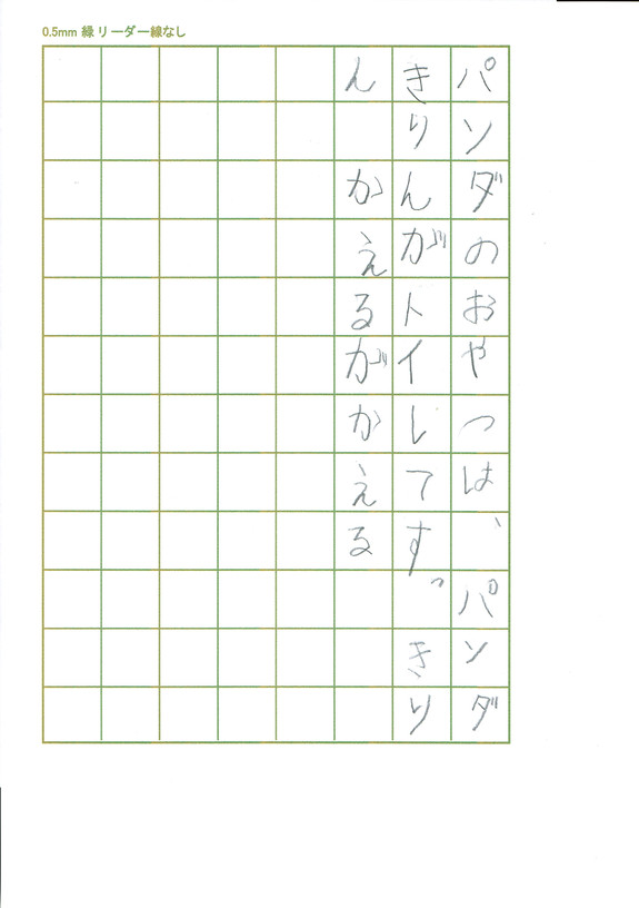 上の文字を見ると、罫線が0.3mmくらいまではマスの真ん中にしっかりと書けていますが、0.2mmや0.1mmの罫線だと、マスからはみ出してはいないものの字が大きくなったり、マスの中で右や下に寄ったりしているのがわかります。実際0.2mmの紙をわたしたとたん、「うすいー」と声を上げていました。