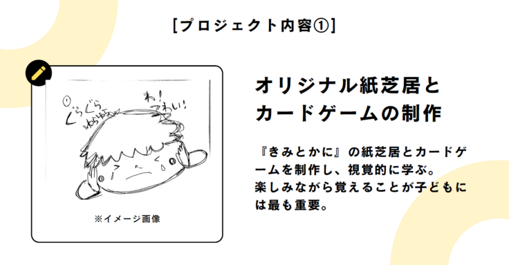 【プロジェクトに向けた準備】 ◇1月31日イベント準備・・・会場(150名収容)の確保、企画、集客 ◇紙芝居・カードゲーム・・・制作中、印刷会社選定(相見積) ◇手遊び歌・ダンス(体操)・・・振り付け考案中、動画制作 【資金の用途】 ◆「きみとかに」紙芝居・カードゲーム制作費(40万円) ◆手遊び歌・ダンス動画製作費(5万円) ◆イベント会場費・準備費(35万円)+スタッフ交通費、広告宣伝費 ◆ステッカー製作費(6万円) ◆クラウドファンディング手数料(14万円)