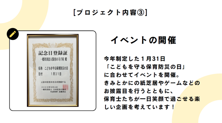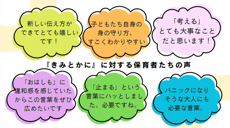 子どもや保育士だけでなく、小学生・障害のある方・高齢者など、すべての人が使える合言葉として広げます。