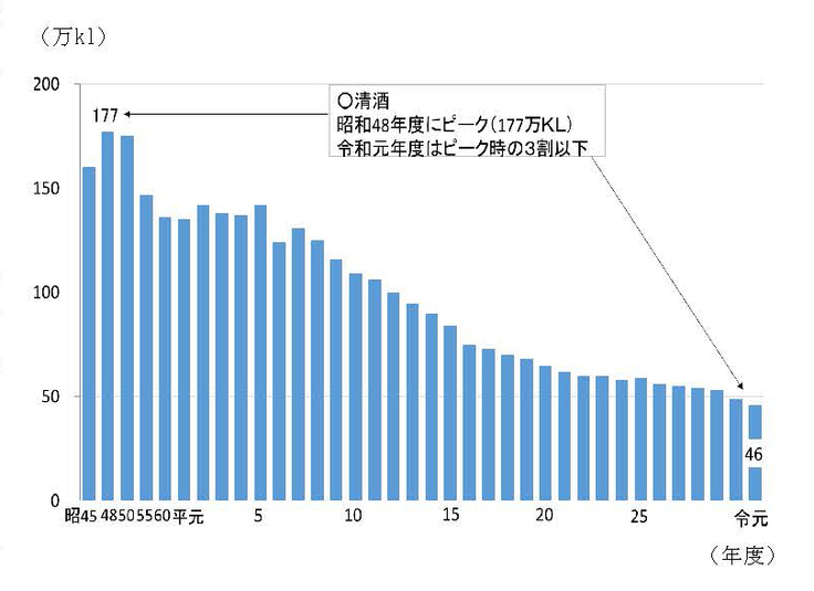 清酒の課税移出数量の推移(出典; 国税庁ホームページ "酒のしおり(令和2年3月)" より)