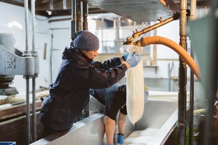 発酵の終わったもろみを1枚ずつ酒袋に詰めて搾り、酒と酒粕に分けます。2日間3回の袋の移動が必要で効率の悪い重労働な反面、お酒に優しく搾りすぎないため、雑味の少ない酒粕を多く含むお酒を醸す事が可能となります。これは先代の能登杜氏 畳伸一氏が、「大変な作業だが、お酒に優しい搾り機なので残すべきである」と現杜氏 園田睦雄杜氏が伝承しております。