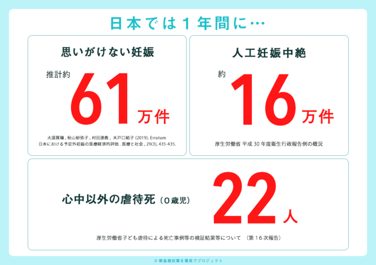そして、児童虐待死(心中以外)が最も多いのは生後0日。その背景には、思いがけない妊娠があることも少なくありません(参考文献10)。