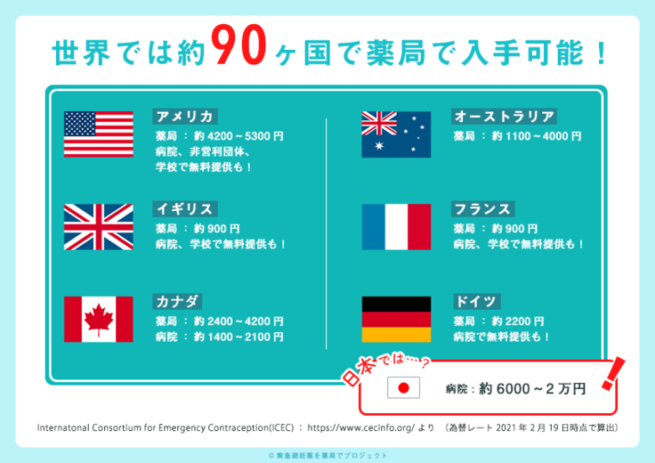 価格帯も5千円未満のところが多く、若者には無料で提供する国も少なくありません。WHOの勧告では、「意図しない妊娠のリスクを抱えたすべての女性および少女には、緊急避妊にアクセスする権利があり、緊急避妊の複数の手段は国内のあらゆる家族計画プログラムに常に含まれねばならない。」とされています。