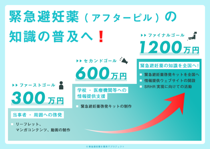 本クラウドファンディングを通し、緊急避妊薬や性の健康についての情報が、当事者・周囲の人や、提供者・支援者等の人たちに行き届き、女性が健康を守るために、安心して、適切かつ安全に、緊急避妊薬にアクセスできる社会の実現を目指します。
