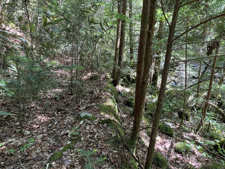 この丸太を運ぶための木材搬出路は、木馬道(きんまみち)と呼ばれていました。