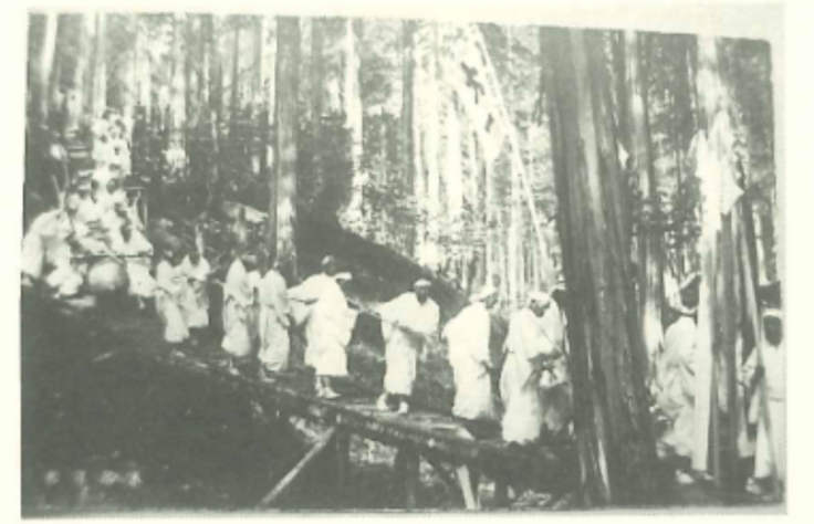 まちの材木はすべて人力で搬出されていました。杣人によって伐られた材は、木馬(きんま)という横木をとりつけた梯子状のそりに積み上げられ運ばれました。