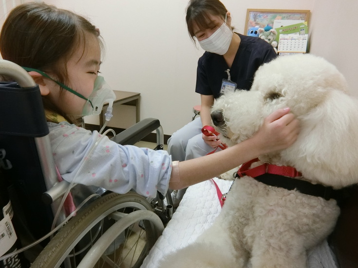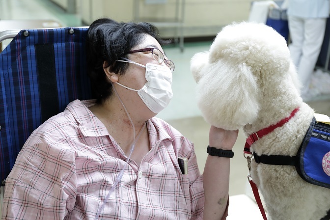 彼女にとっての動物介在療法は、症状のある中でも離床(ベッドから起き上がること)を図り、身体機能を少しでも維持向上させるために必要な時間です。 いつもはなかなか気が進まない車いすへの移動も、モリスの訪問時間は、その時間を楽しみにベッドから起き上がり車いすに移動し、呼吸補助の機器を外し酸素チューブに切り替え、モリスの様子やハンドラーとの雑談で声を出して笑ってくれます。モリスの手をずっとずっとなでてモリスからの要求にも応えてくれます。